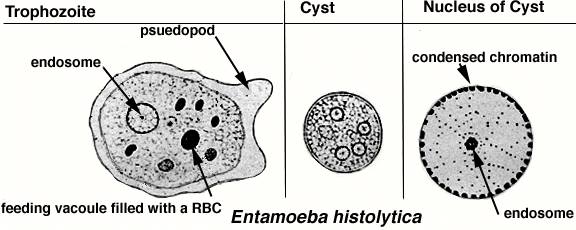 - Erythrophagocytosis (ingestion of red blood cells by the parasite) is the only morphologic characteristic that can be used to differentiate E. histolytica from the nonpathogenic E. dispar. However, erthrophagocytosis is not typically observed on stained smears of E. histolytica.