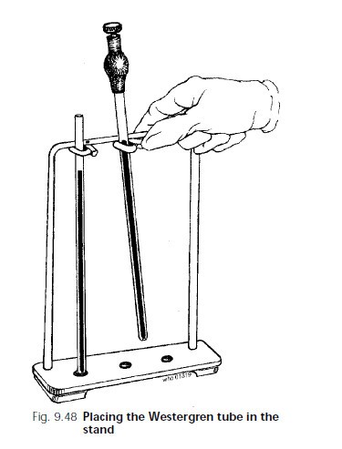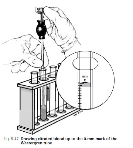 4. Draw the citrated blood into the Westergren tube (using a rubber safety bulb) upto the 0-mm mark .